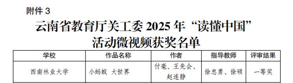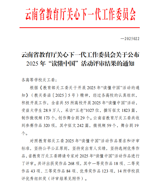 近日,云南省教育厅关心下一代工作委员会公布了2025年“读懂中国”活动评审结果。国土空间信息学院师生积极参与、精心创作,在征文、微视频等多个类别中荣获佳绩,展现了学院在文化育人、实践育人方面的扎实成效。