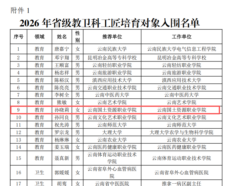 喜报|热烈祝贺我院孙晓莉老师入选2026年云南省教卫科工匠培育对象